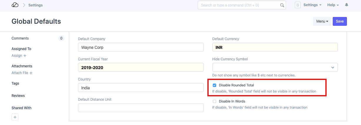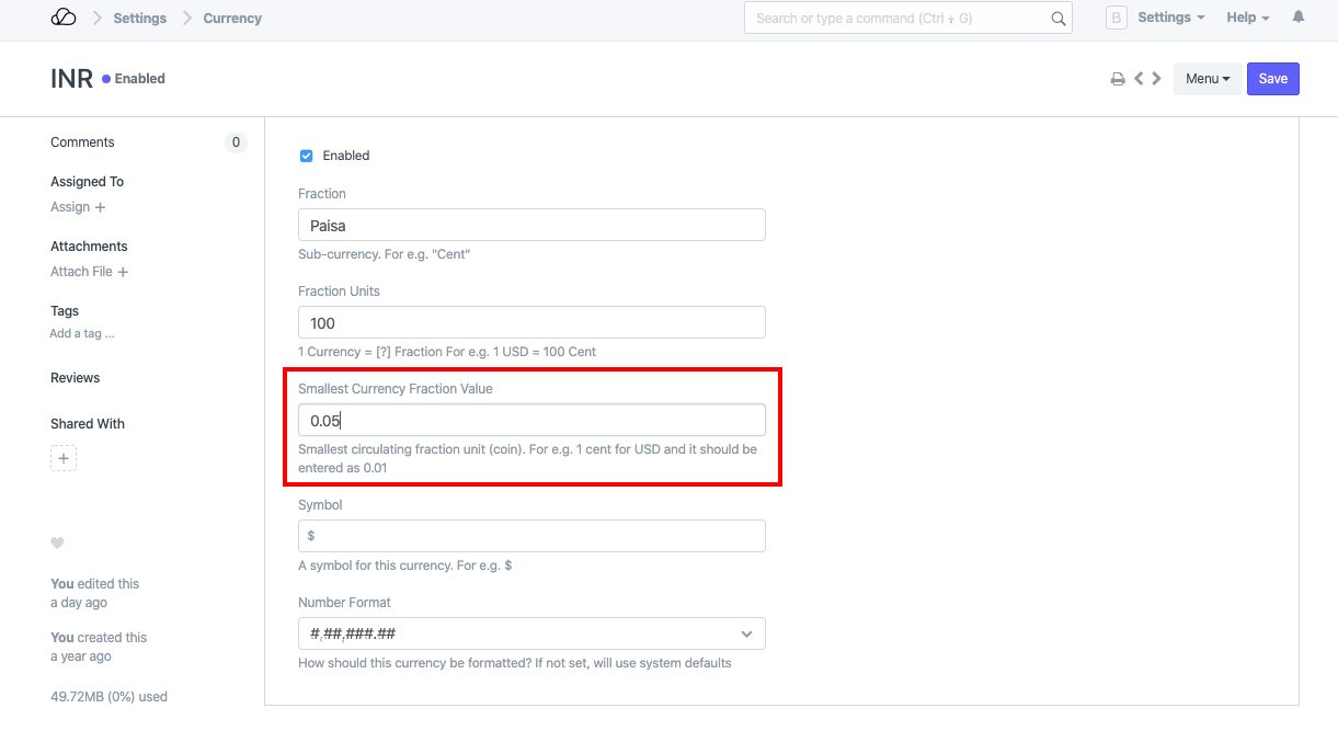 这里确保舍入设置正确。例如,INR 的最小分数值应为 0.01,而不是 0.05。更新该值,然后更新交易。