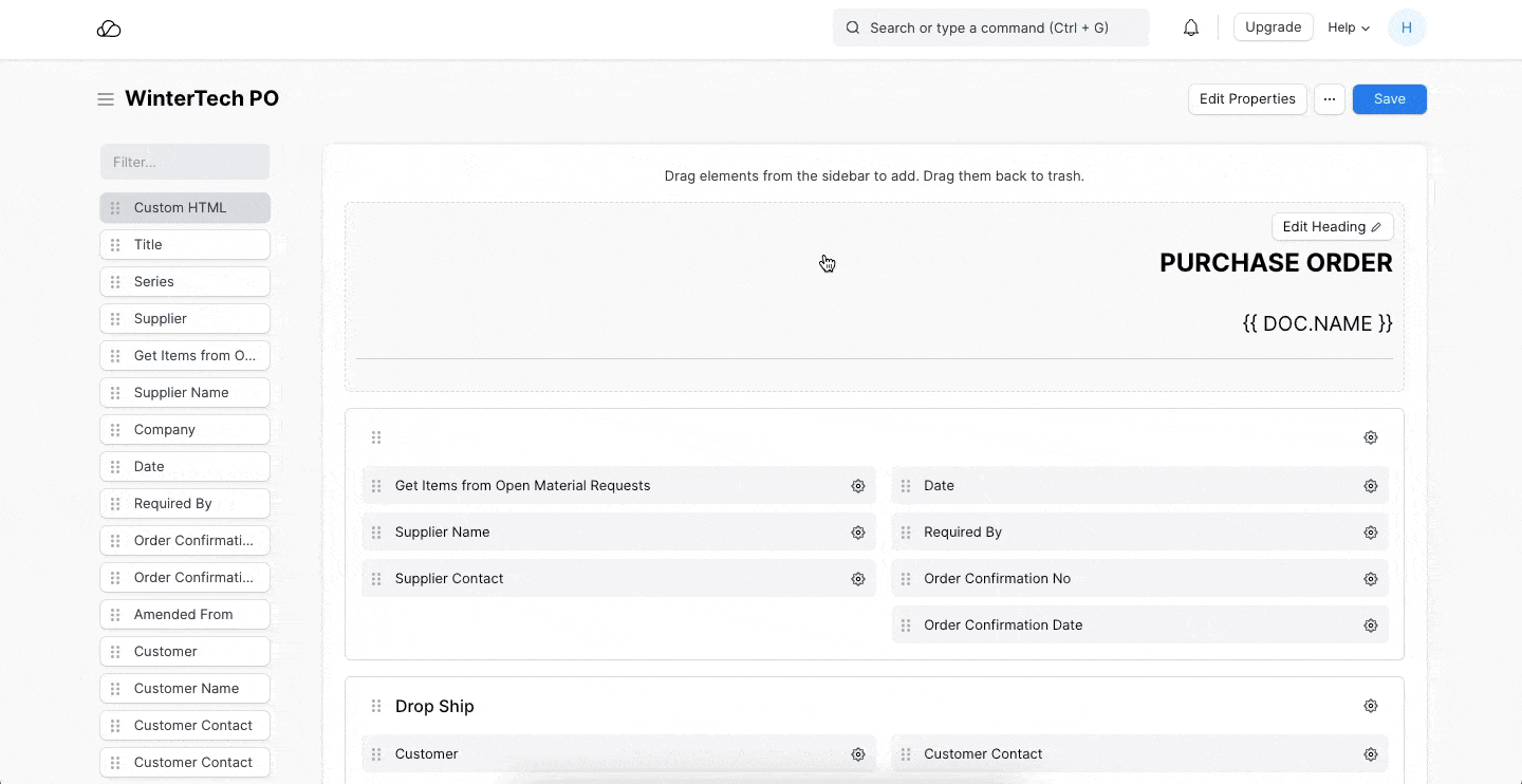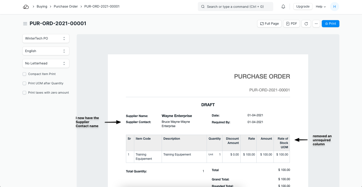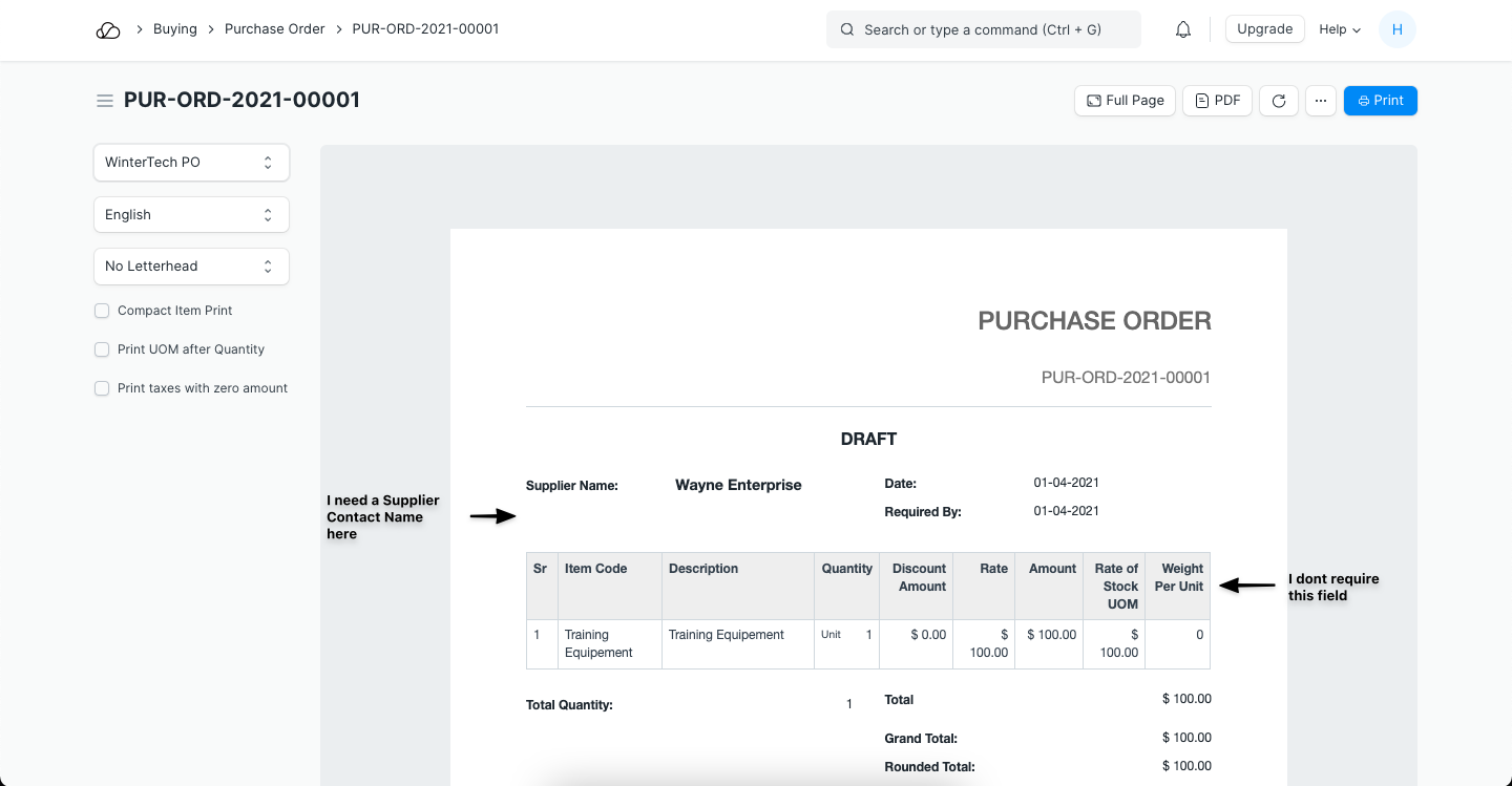 为了进行解释,让我们考虑一下采购订单,它在打印格式中具有以下字段,在这里,我想在供应商名称下添加供应商的联系人姓名,并从项目表中删除每单位重量列。