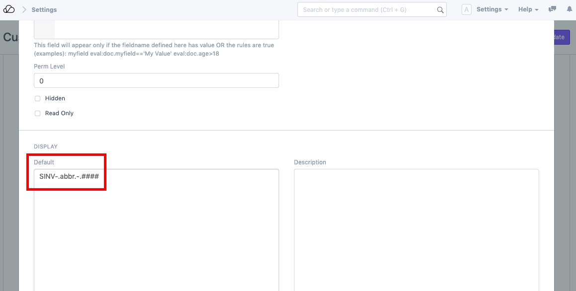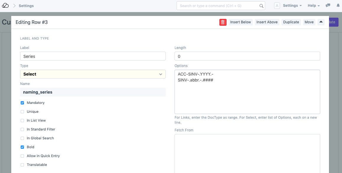 1. 现在,在“自定义表单”本身中,转到“命名系列”行并将其展开。在“选项”框中,在新行中添加另一个条目(以销售发票为例)“SINV-.abbr.-.####”并将其设置为默认值。