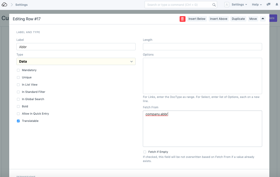 2. 接下来,在“公司”字段下方添加另一个字段并将其命名为“Abbr”。在其 Fetch From 输入中添加“company.abbr”。