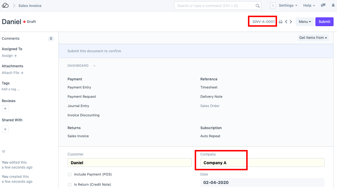 现在,转到销售发票并创建一张。选择公司,命名系列将根据公司缩写自动更新。