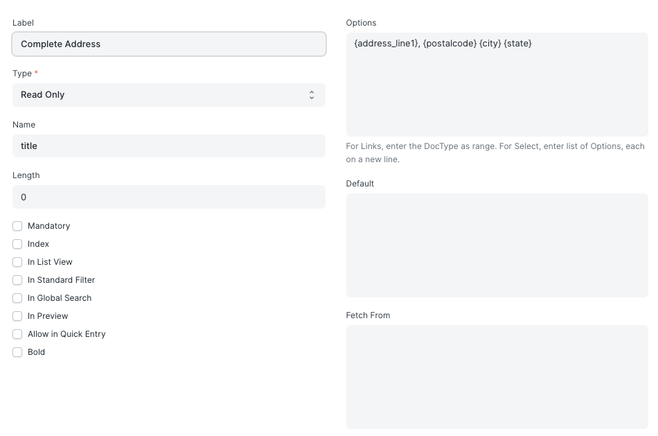 这可以扩展到创建具有不同字段的合并值的自定义字段,并将它们合并到一个全新的字段。最佳用例是轻松为自定义文档类型创建地址,无需任何自定义脚本。