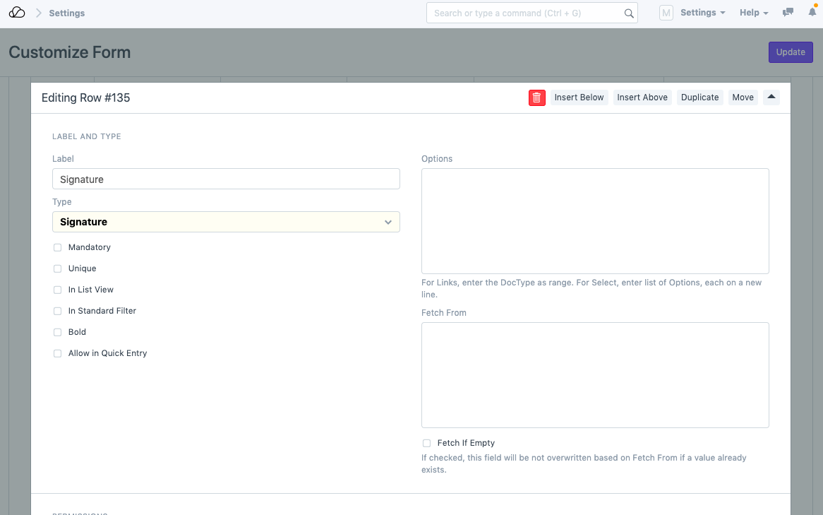 3. Fields 表中,输入一个名为 Signature 的新行(字段),然后将 Field Type 选择为 Signature。