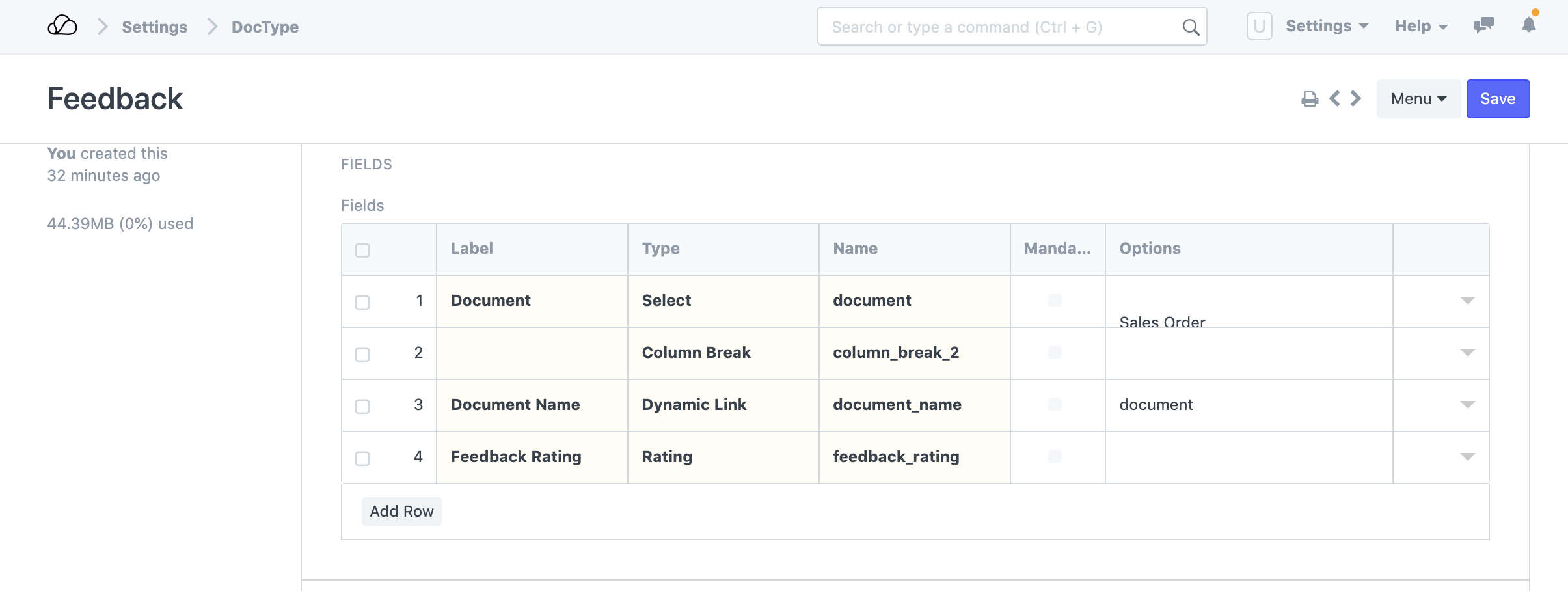 创建 DocType 后,只需从反馈文档类型中获取所有标准字段即可创建 Web 表单。