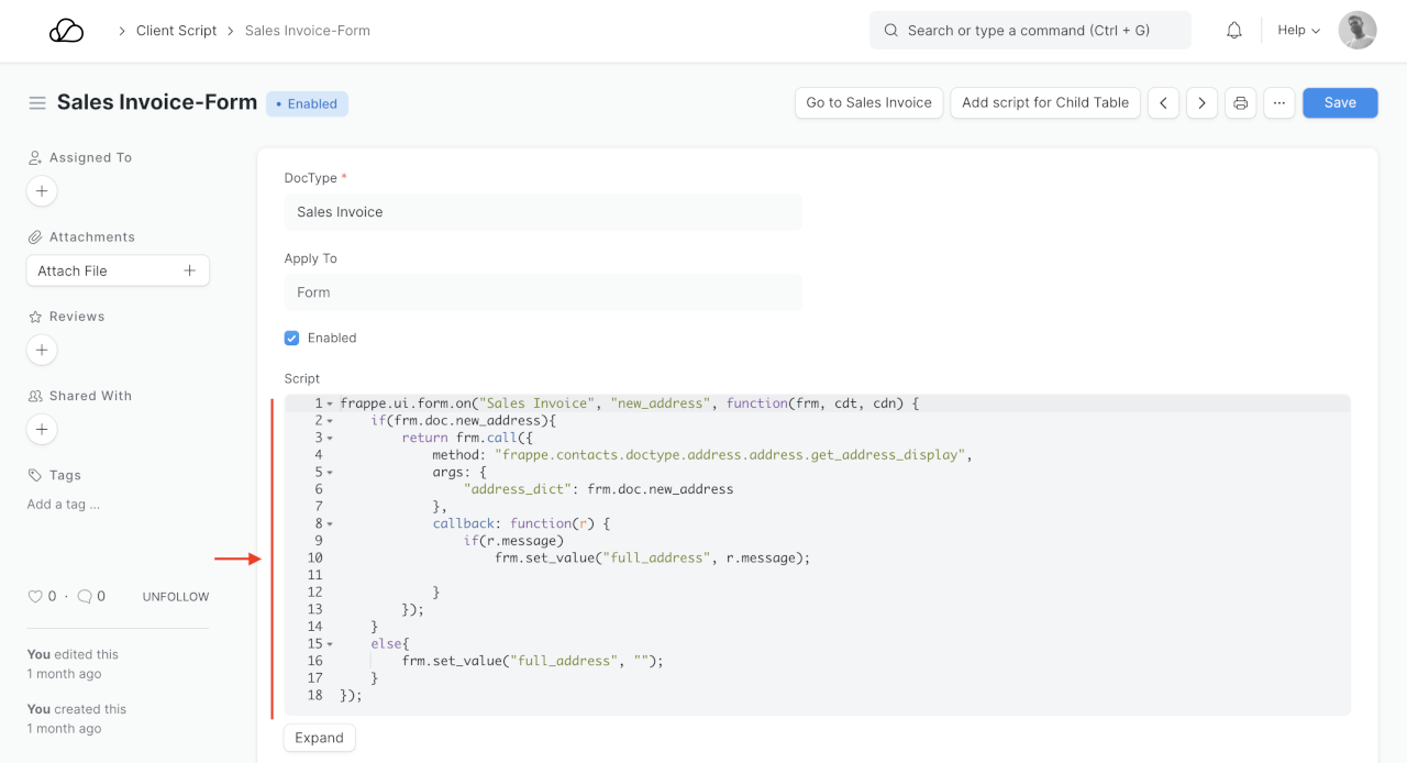 在搜索栏上搜索“客户端脚本”,然后创建一个新的客户端脚本。选择我们需要获取地址的所需 DocType。