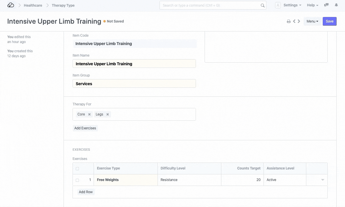作为治疗师,您可能会为患者开出多种不同的治疗方法,从强化上肢训练到功能活动等等。每种疗法都可能有一组练习。 OneOfficeERP 可帮助您使用“治疗类型”DocType 将治疗模板化。通过此功能,您可以创建治疗并将其链接到医疗保健服务单位,添加标准费率和计费项目详细信息,还可以根据身体部位添加练习。