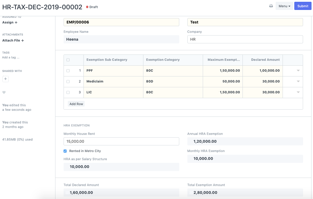 • 如果员工有任何类型的投资或纳税申报,例如 PPF、保险、共同基金、HRA 等,请将这些添加到“员工免税申报”中。附截图: