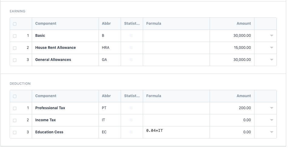 • 创建薪资结构并在扣除部分添加所得税,将金额部分留空。除此之外,请添加基于公式的教育过程。附截图: