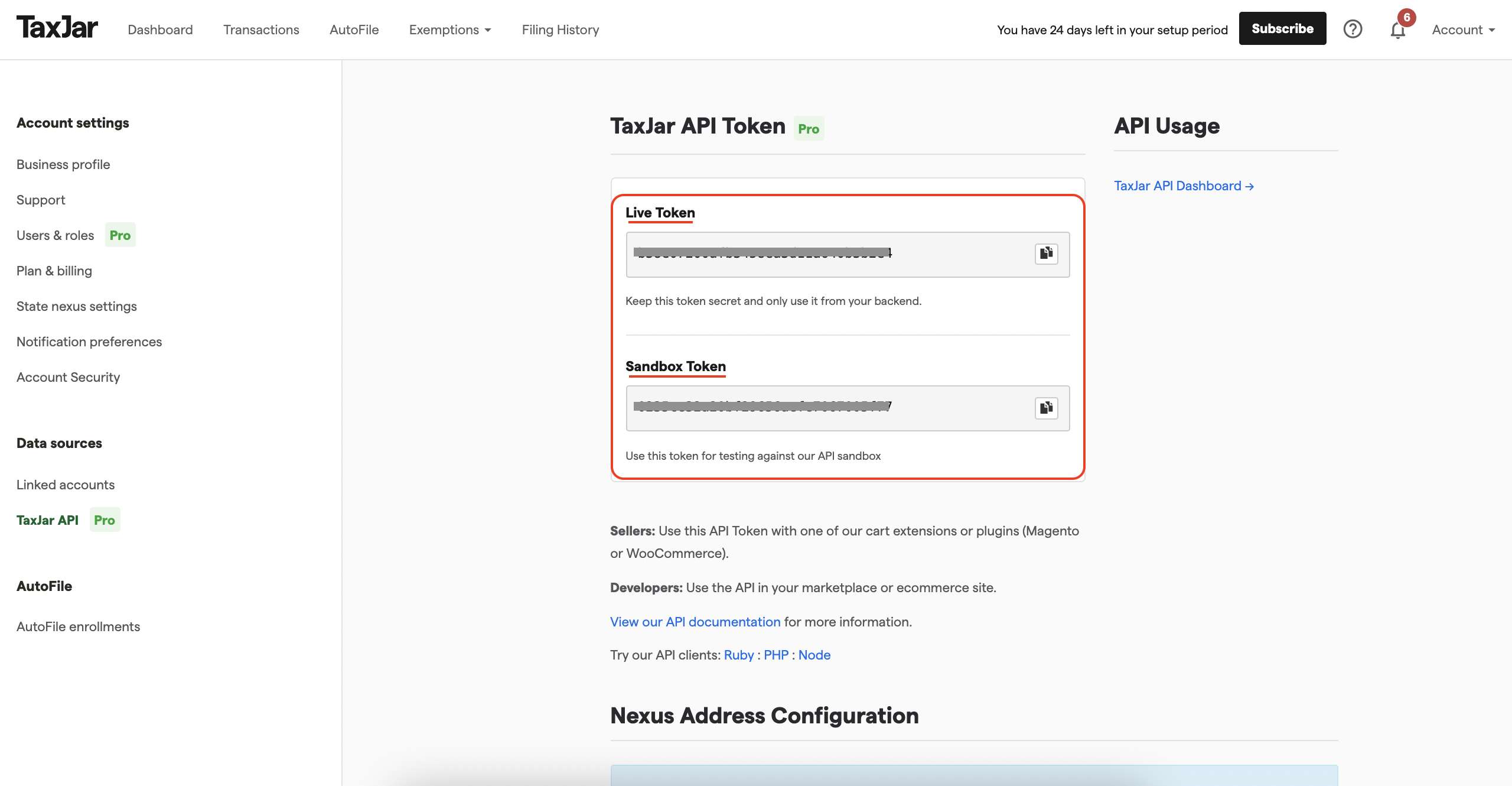 您将需要帐户中的 API 令牌来设置 Taxjar。