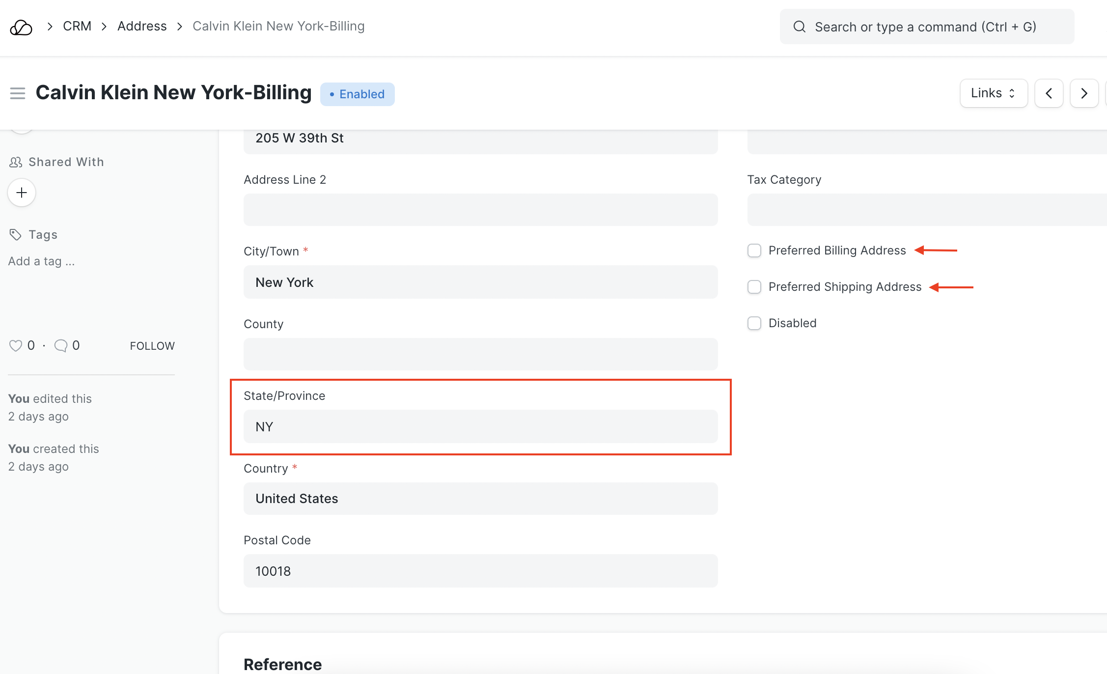 1. 创建地址时,请确保在 州/省 字段中输入正确的州。 TaxJar 要求各州采用 2 个字母的格式,例如。纽约被视为 NY,但不需要强制以这种方式输入,系统会自动将其转换为 2 个字母的州代码。