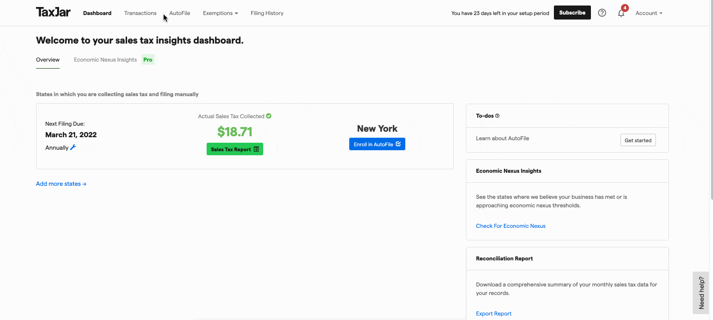 请按照官方 TaxJar 页面 此处 上提供的有关向仪表板添加/删除状态的详细说明进行操作,请从上到下遵循他们的说明,因为它将帮助您完美设置所有内容。