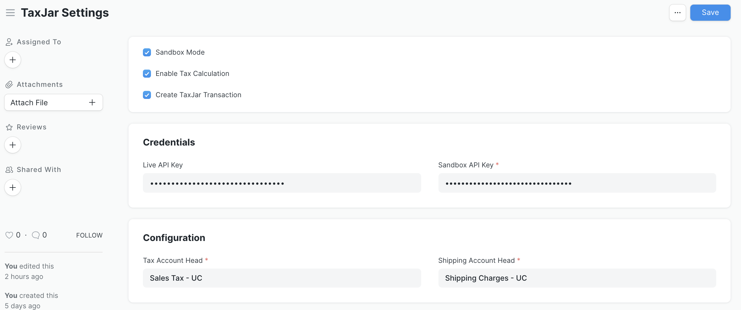 1.启用税收计算,创建TaxJar交易: 2. 您需要启用这些选项以进行自动税计算,这些交易将显示在您的 TaxJar 帐户交易页面上,您可以在其中跟踪它们并分析税务明细。 3. 一旦您进行了一些交易,它们就会自动显示在您的 TaxJar 交易 页面上: 4. 您可以查看所有的交易以及详细的税务明细。 5. 按照上述说明从您的 TaxJar 帐户复制 API 令牌,并将其粘贴到 Live API KeySandbox API key 字段中。 6. 您必须为税费和运费设置两个帐户标题,根据需要选择帐户,配置完所有内容后,单击“保存”即可开始!