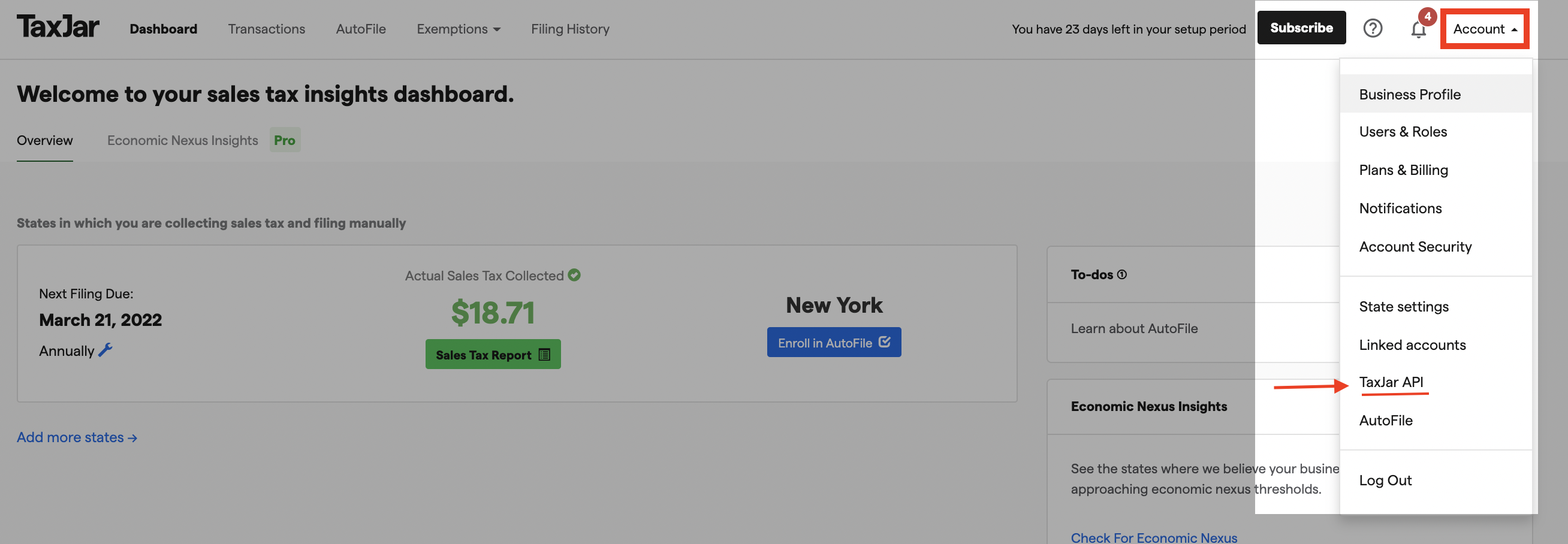 2. 登录到您的帐户仪表板,单击 Account 按钮,然后单击选项下拉列表中的 TaxJar API
