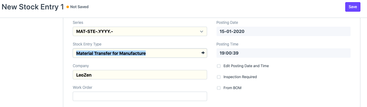1. 创建一个库存条目目的制造,正在制造的项目将有一个目标仓库,其他项目(原材料)将有一个源仓库。