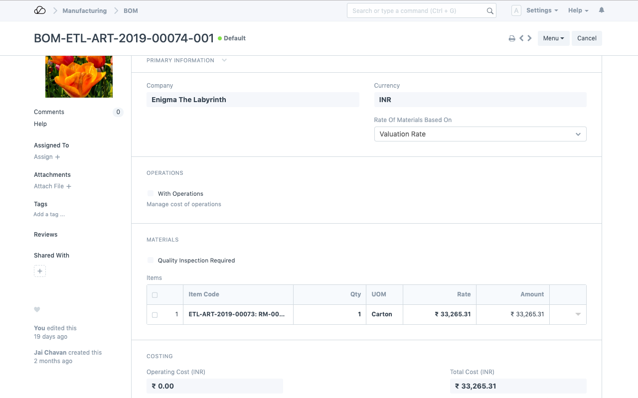 1. 为分包项目创建BOM(物料清单),并包含您发送给分包商的原材料,以获得成品/半成品。此 BOM 中不会有任何操作,因为这些活动不是在制造商端完成的。在我们的例子中,RM-111-Colored-Flower的BOM如下: