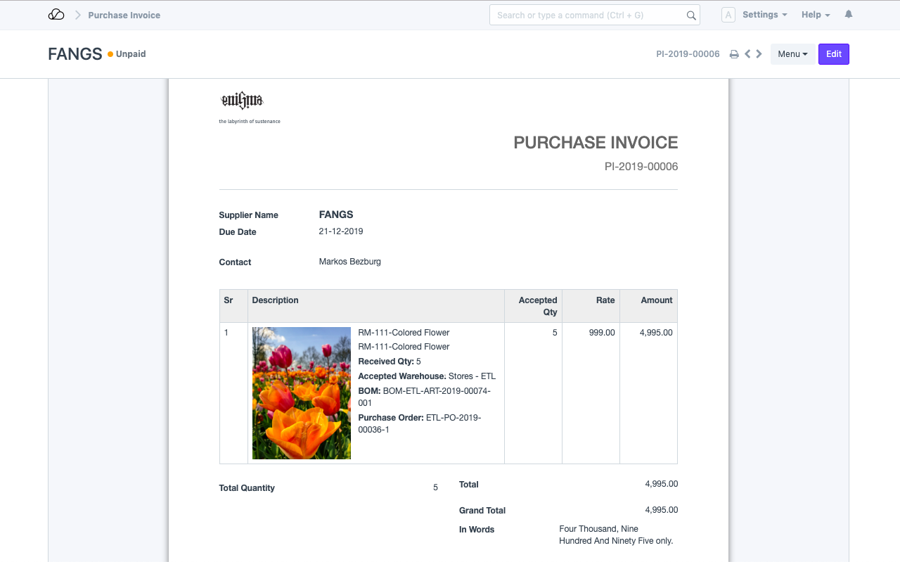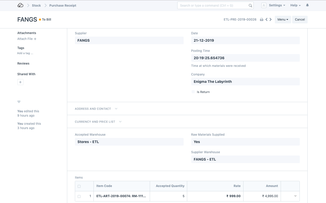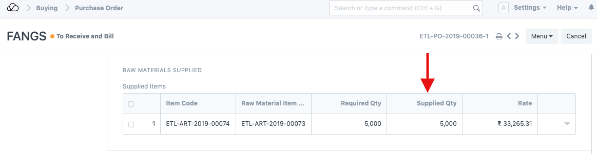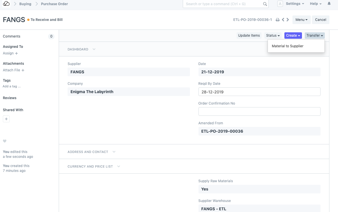 1. 现在,您需要创建采购订单以从外部方/供应商采购该项目。确保在“供应原材料”字段中选择“是”,然后选择将原材料转移给供应商的仓库。请注意,这也可以是一个虚拟仓库,只是作为在将物料转移给供应商时制作库存条目的占位符。以下是我们示例中的采购订单:
