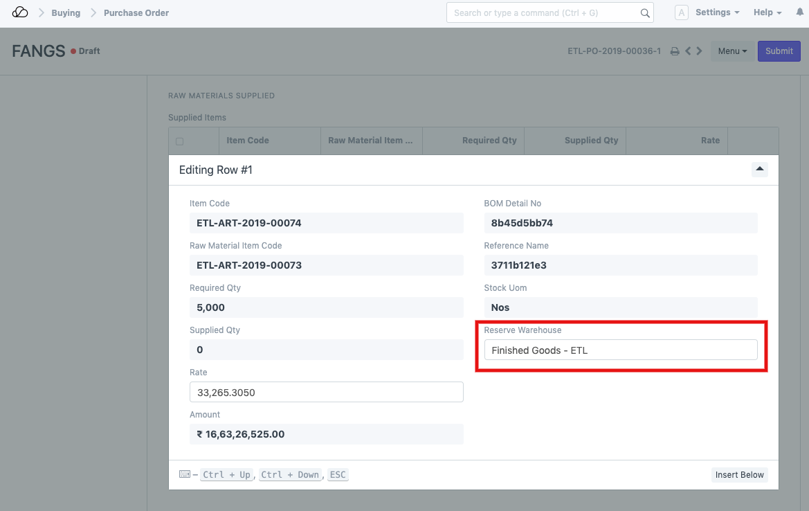 1. 还有另一个子表显示根据此采购订单转移的原材料的状态。在该表中,您需要选择“储备仓库”,原材料将从该仓库转移到我们在上一步中选择的虚拟供应商仓库。该表还告诉您已经供应了多少商品,在我们的例子中,它为零,因为我们尚未提交订单并供应原材料。