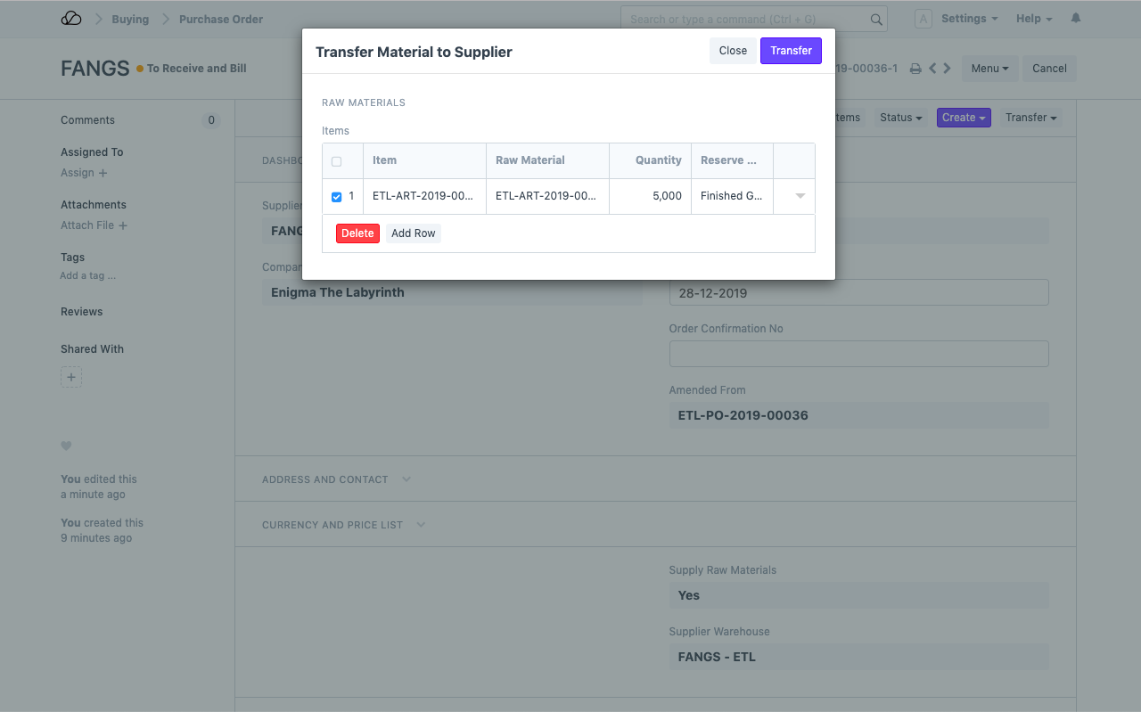 1. 提交采购订单后,将出现一个“转移”按钮,用于创建库存条目以将原材料转移给外部供应商: