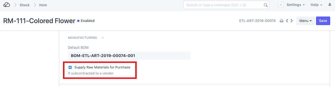 1. 在外协物料的物料主数据中,确保您已启用“供应采购原材料”选项。在我们的示例中,该项目是“RM-111-Colored Flower”