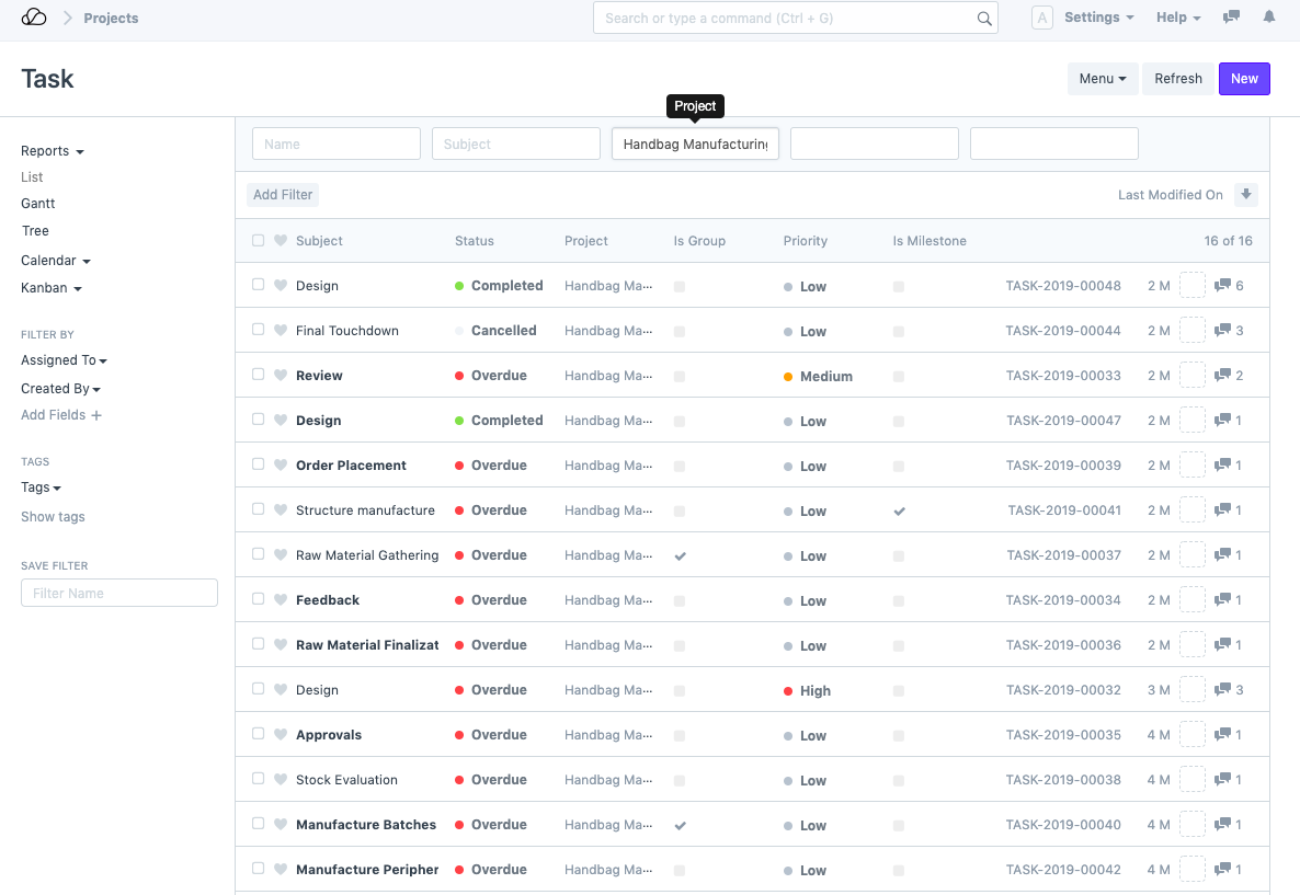2. 进入任务列表并根据项目过滤任务,如下所示: