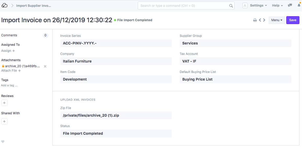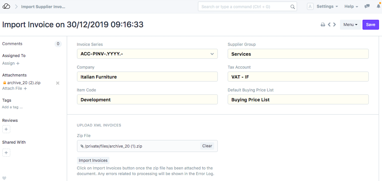 自 2019 年 1 月 1 日起,在意大利从事国内 B2B 和 B2C 交易的国内企业必须采用电子发票。 OneOfficeERP 具有从供应商向政府提供的 XML 文件导入供应商发票的功能。