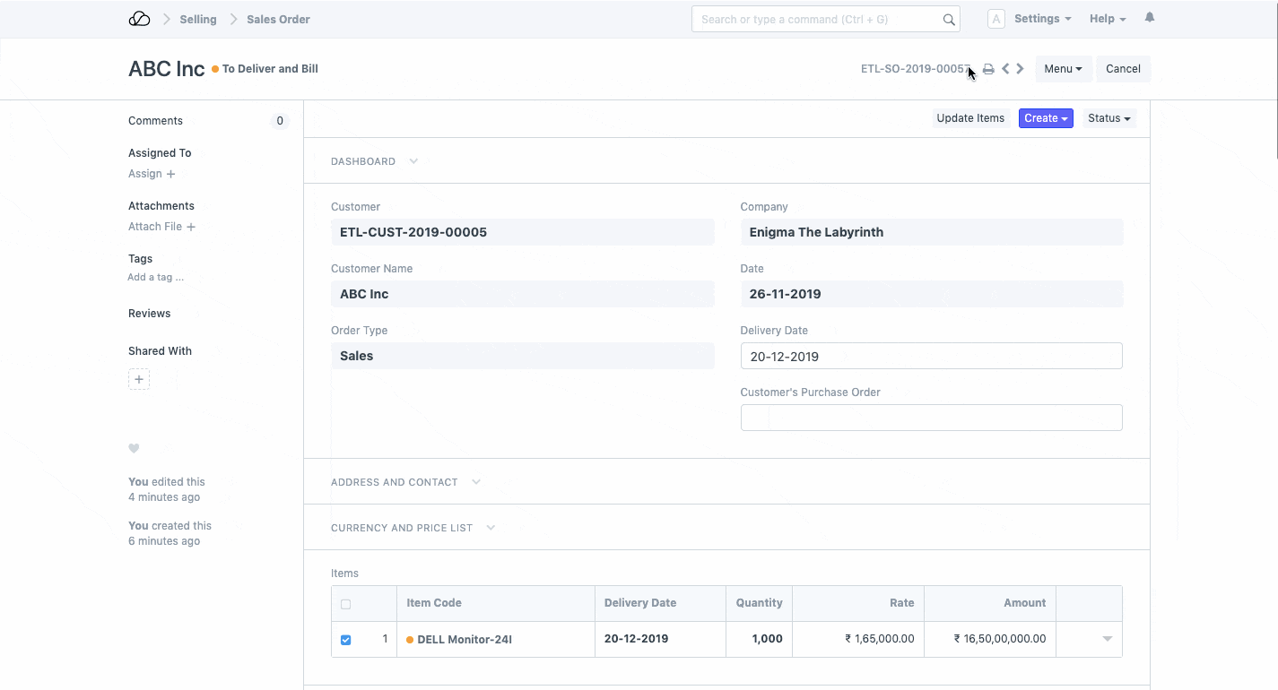 从销售订单文档本身,您可以为此发货创建采购订单、跟踪交货并向客户相应开具账单。