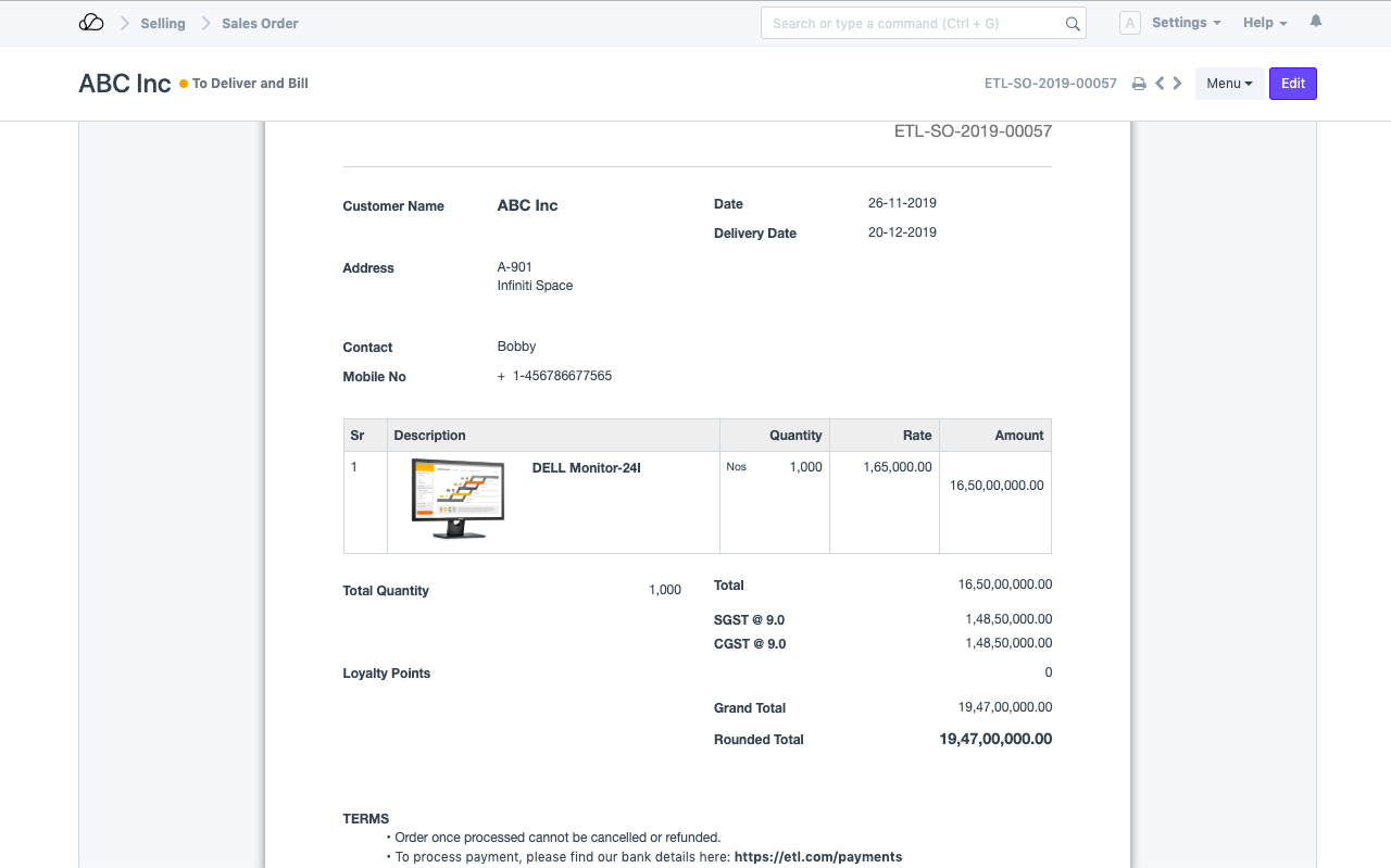 考虑一家处理计算机显示器的企业。现在,该零售商已收到客户 ABC Inc. 的 1000 台戴尔 24 英寸显示器订单。
