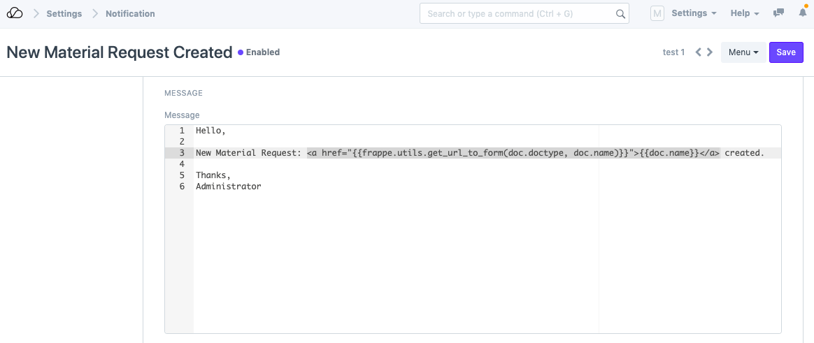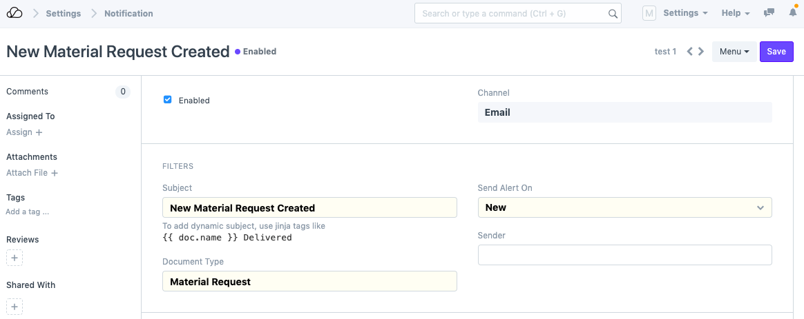 2. 为任何 DocType 创建一个新的通知。在本例中,我们采用了在创建每个新材料请求时发送电子邮件通知的示例,如下所示。