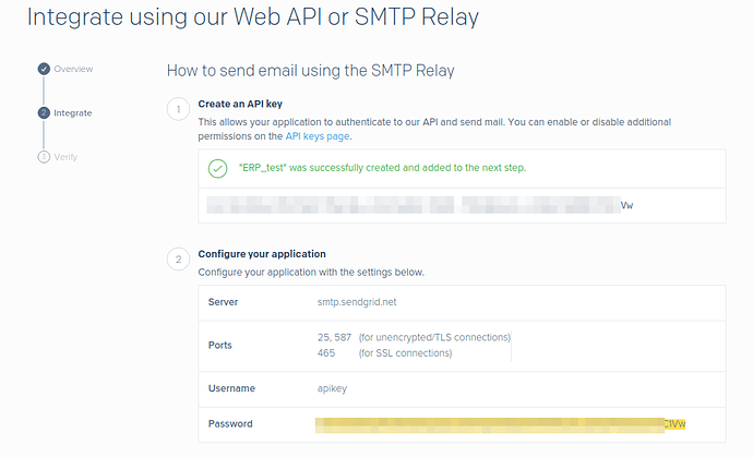 您需要创建一个 API 密钥来验证您的应用程序。在本例中为_OneOfficeERP_。了解有关 SendGrid 与 SMTP 集成的更多信息 此处