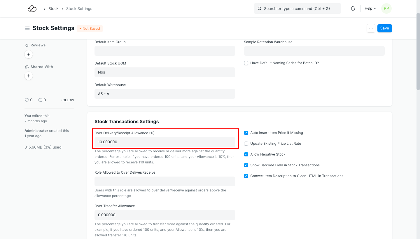 创建发票时,还会根据之前的交易(例如销售订单)验证项目的费率。从采购订单创建采购收据或采购发票时,这也适用。更新“允许超额交货或收货达到此百分比”将在所有销售和采购交易中生效。