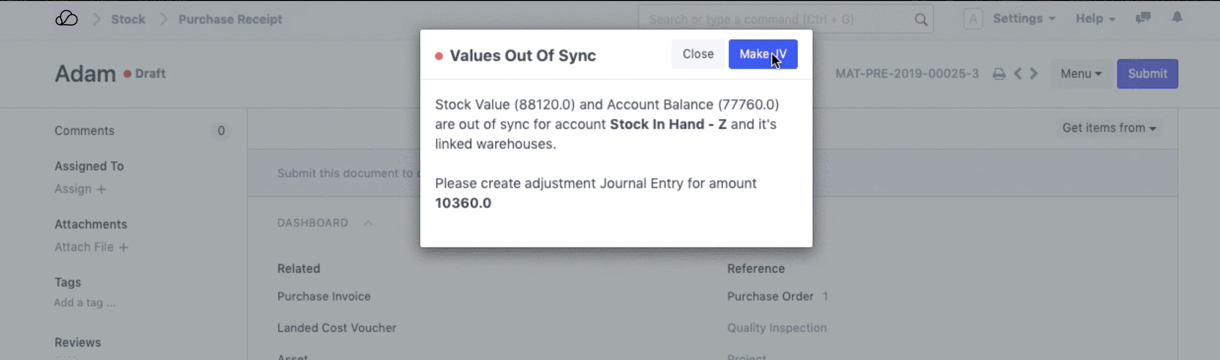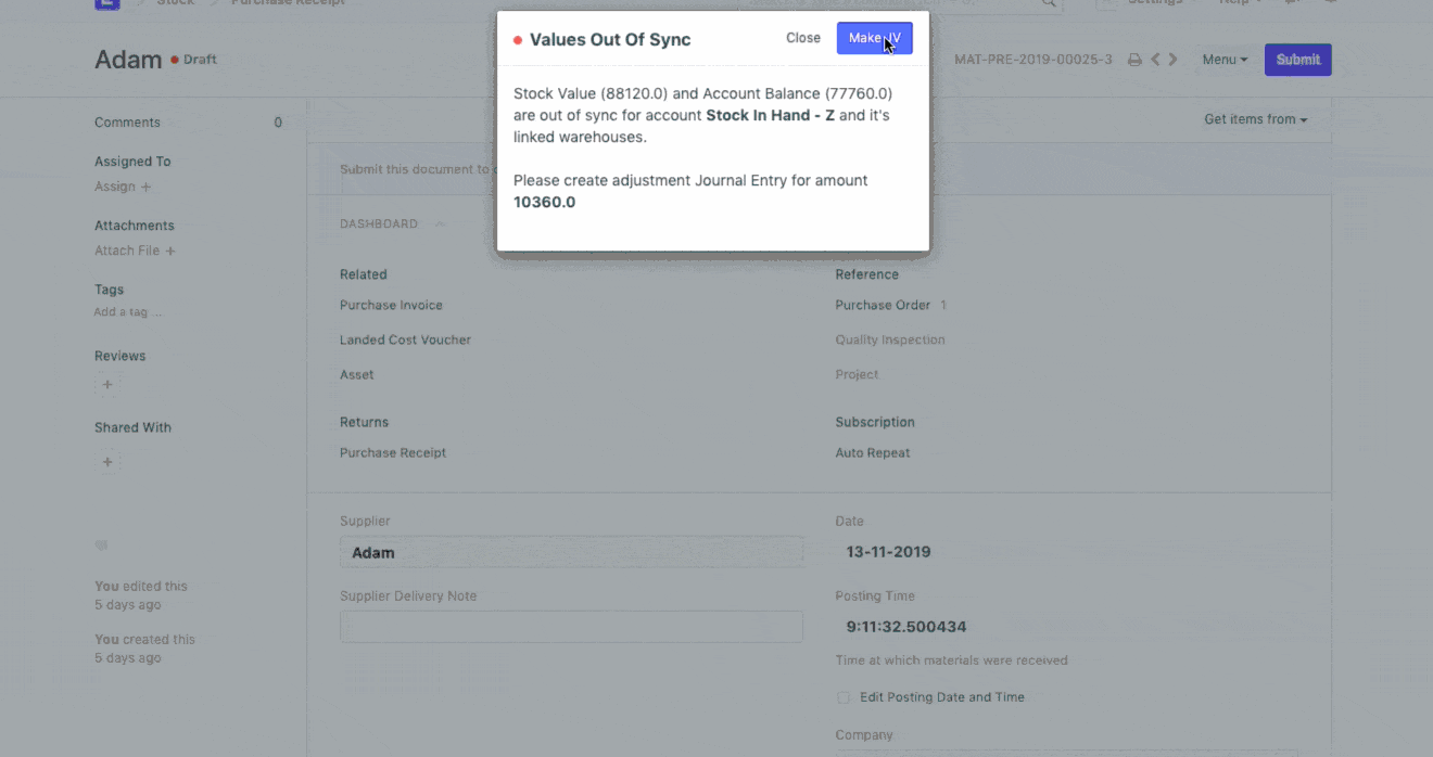 要继续操作,您可以通过创建日记账分录轻松同步库存余额和库存账户余额。单击验证消息中的“创建日记帐分录按钮”,更新相关帐户并提交日记帐分录。