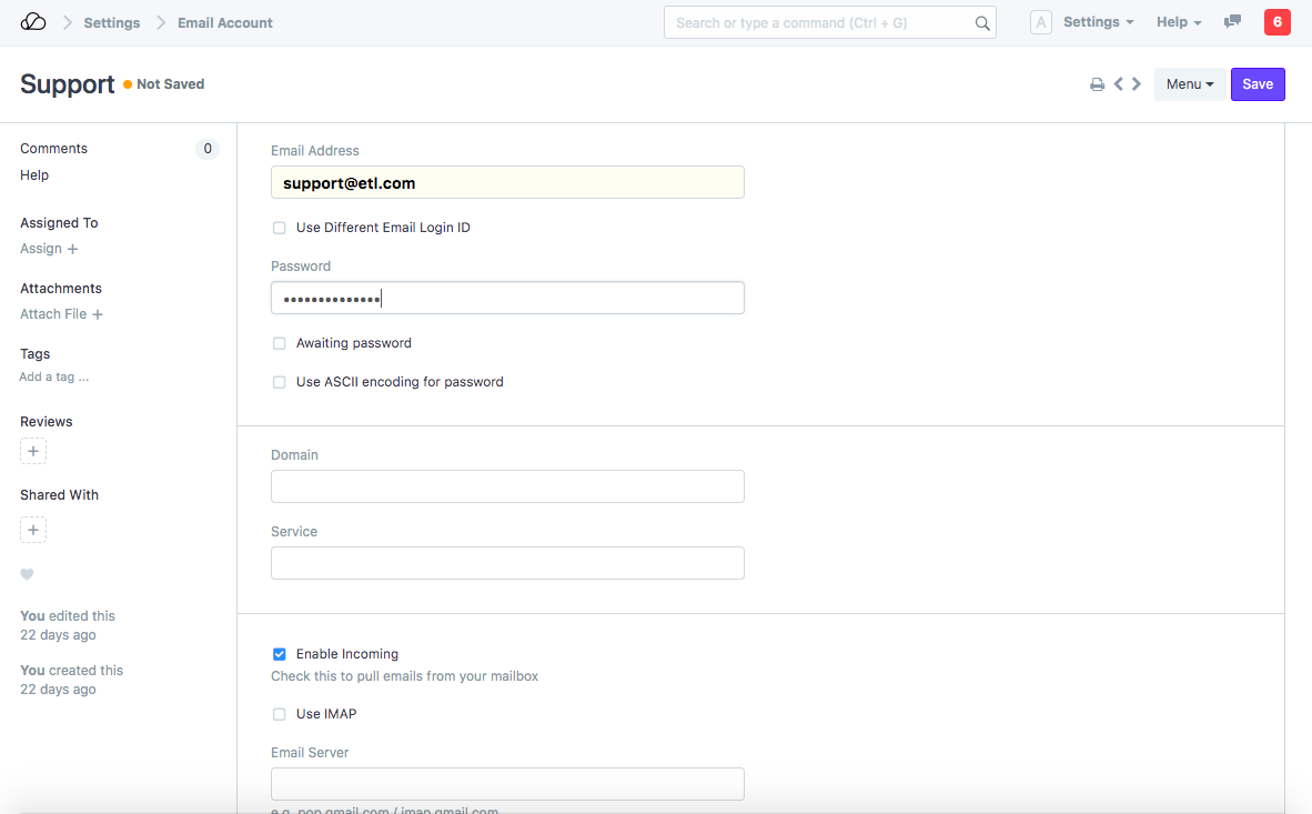 首先,我们需要设置一个电子邮件帐户,将收到的传入电子邮件附加到 OneOfficeERP 的“问题”DocType 中。