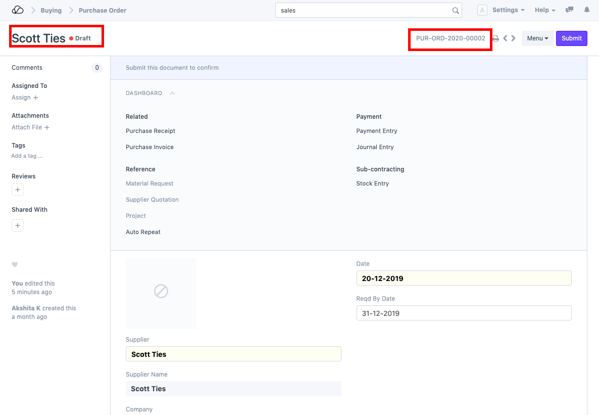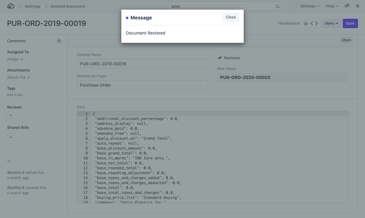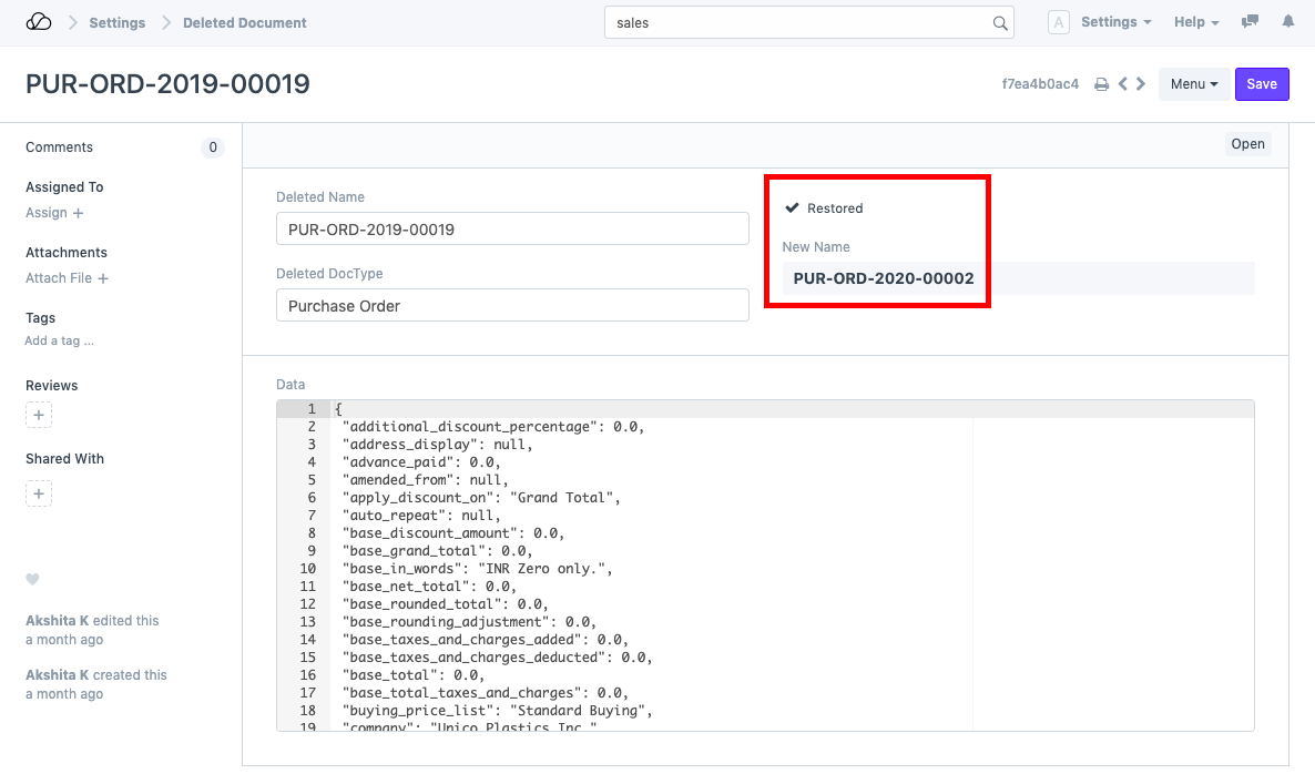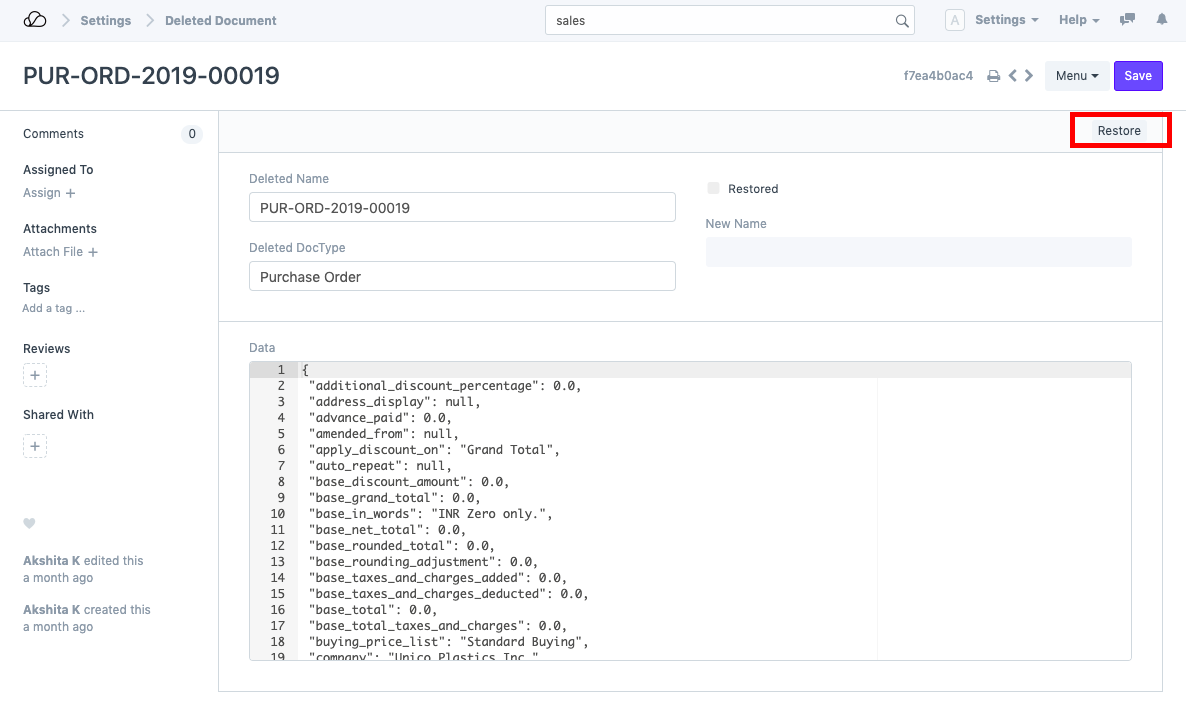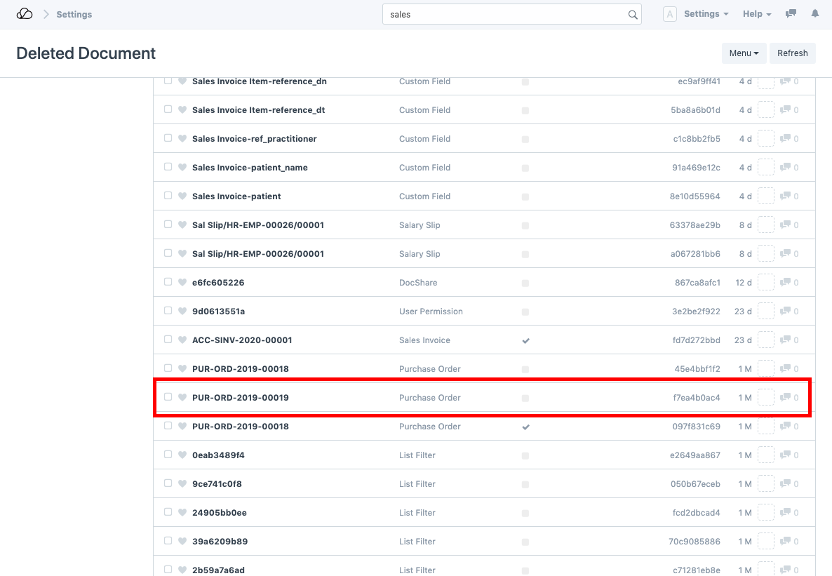 2. 搜索已删除的文档。您还可以根据已删除的文档类型过滤掉文档。例如,我们需要恢复采购订单 PUR-ORD-2019-00019。为此,请在已删除的文档列表中搜索相同的内容并将其打开。